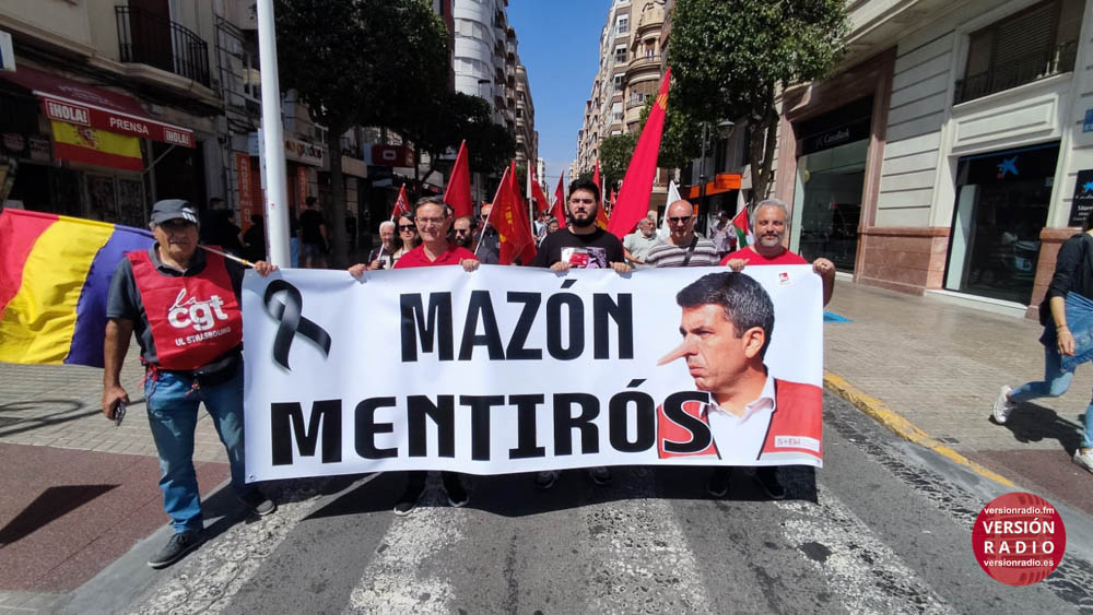 A lo largo de la manifestación se han podido ver pancartas del PSOE, de la sección sindical de Aigües d’Elx, de Compromís, de la HOAC, de la Intersindical, de la Plafatorma de Pensionistas, de la Plataforma por la Reversión del Hospital del Vinalopó, del Consejo Sindical Obrero, de la CNT, de la PAH e incluso se ha podido ver una pancarta con la imagen del president de la Generalitat en la que se podía leer “Mazón mentirós”.
