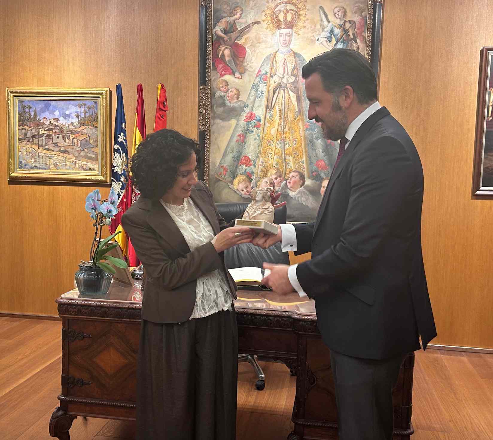 La consellera de Servicios Sociales, Familia e Infancia, Elena Albalat, ha visitado por primera vez Elche y a primera hora de la mañana ha sido recibida por el alcalde y varios miembros del gobierno municipal en alcaldía. Ha firmado en el libro de honor del Ayuntamiento y el alcalde le ha hecho entrega de una Dama de Elche como recuerdo. Posteriormente ha tenido lugar una reunión de trabajo.