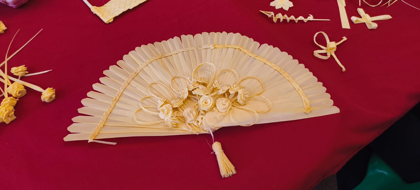 La presidenta a la Asociación de Bolillos y Artesanía de Elche y Comarca, Antonia Miralles, indica a Versión Radio que son más de 30 personas las que participan en el taller de elaboración de palmas. Entre las participantes se encuentra una señora de 93 años, que también hace una gran aportación en la elaboración de palma y detalles de los ramos artesanales.