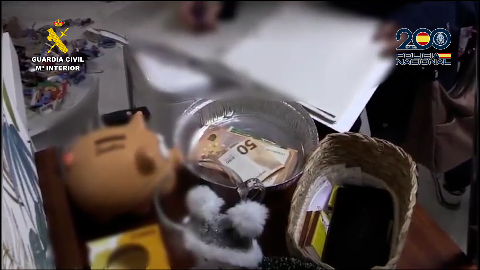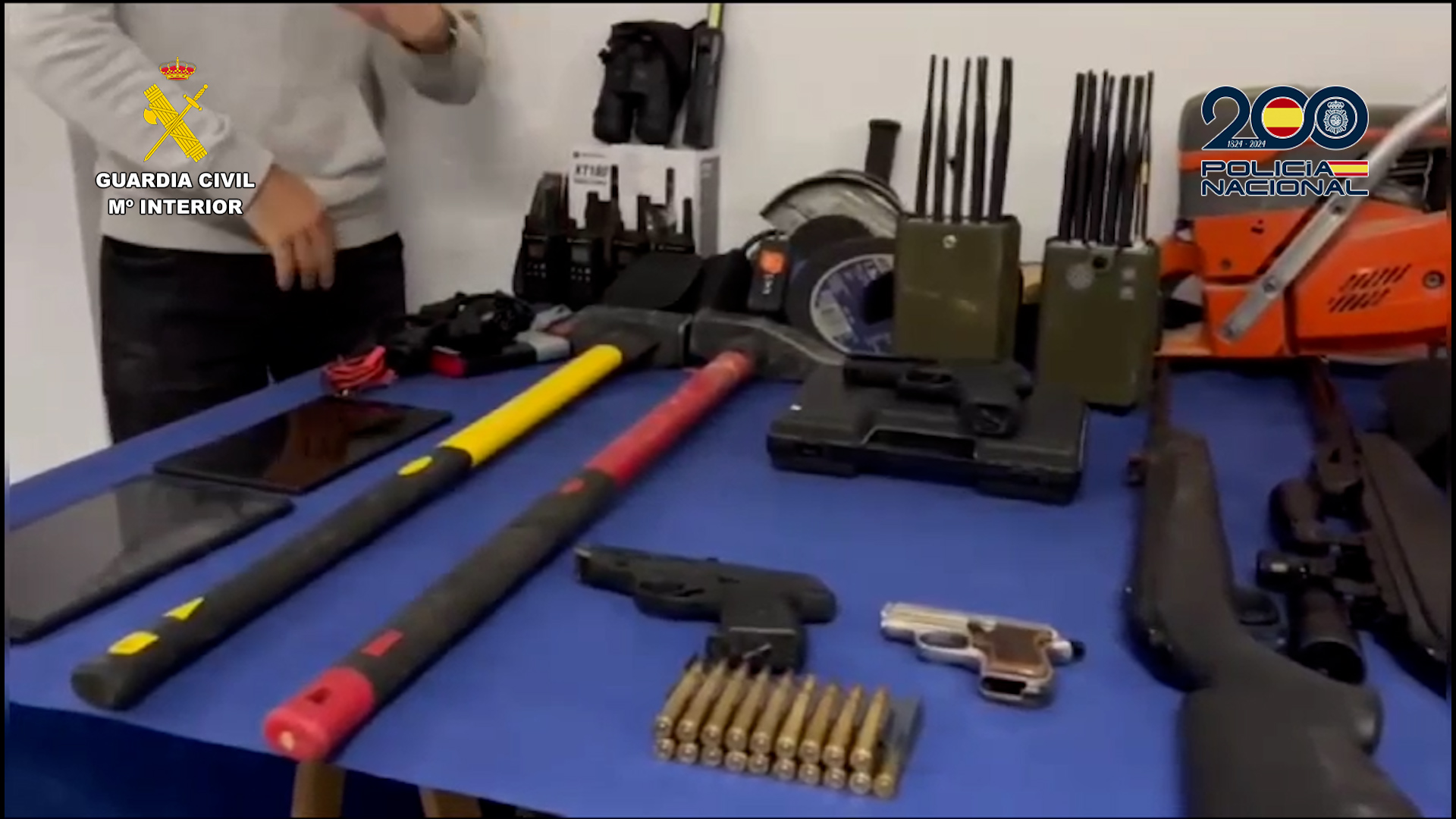 Se intervinieron, entre otras cosas, casi 50.000 euros en efectivo, 16 vehículos a motor, una pinza hidráulica, palanquetas, mazos, cuatro walkie-talkies, dos inhibidores de frecuencia, radiales portátiles, 51 placas de matrícula sin troquelar, dispositivos técnicos para el robo de vehículos, prendas de ropa utilizadas en los robos, así como varias armas cortas y largas de aire comprimido.