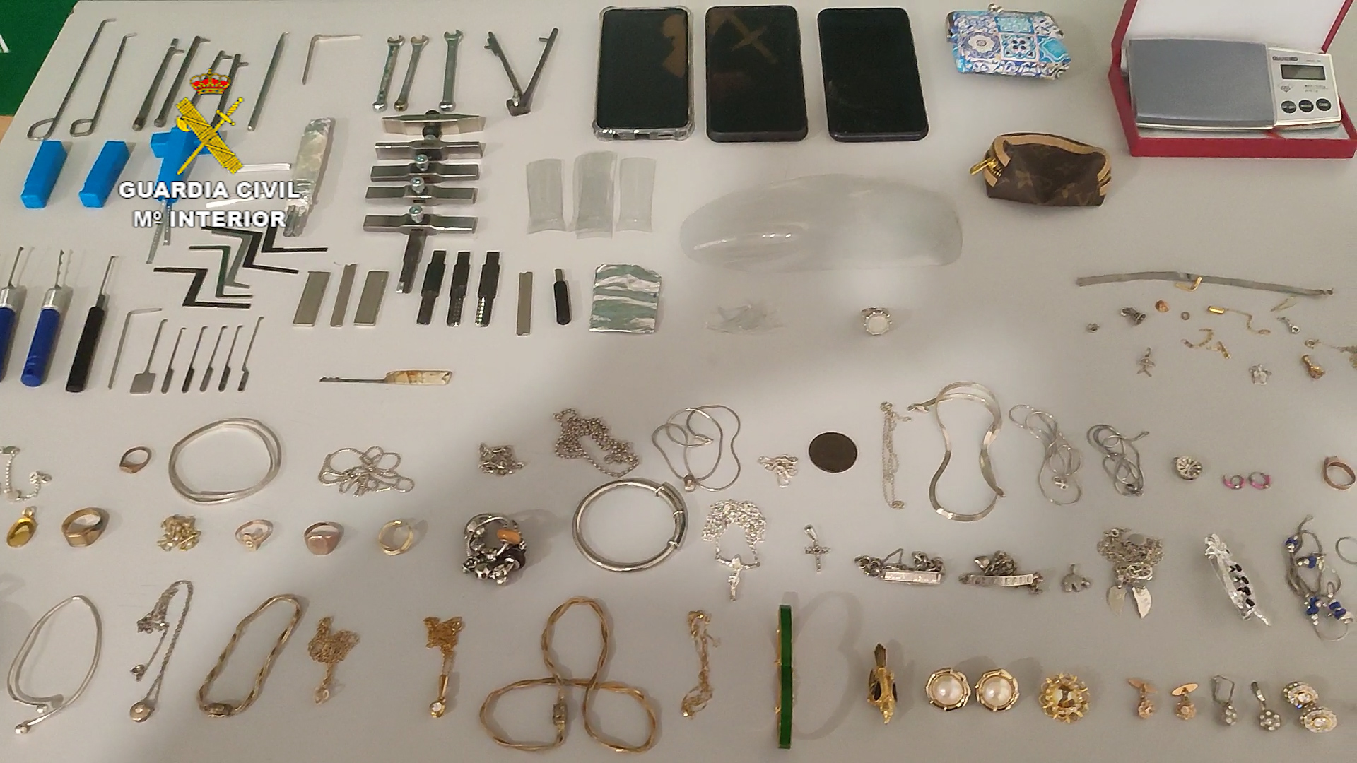 Además de la documentación intervenida previamente, también se incautaron: 14.240 euros en efectivo, 127 piezas de joyerías, un juego de prismáticos, testigos de plástico que utilizan los delincuentes para marcar las puertas de sus posibles víctimas y diversas herramientas para la apertura de puertas, como varios juegos de ganzúas.