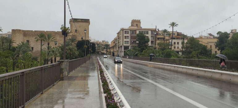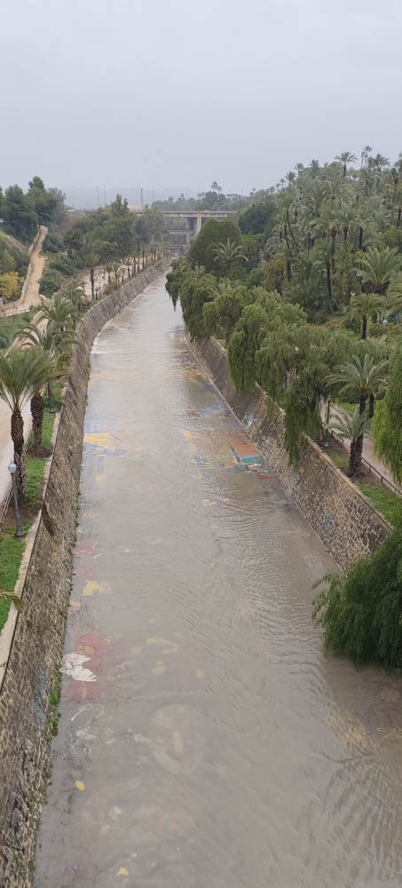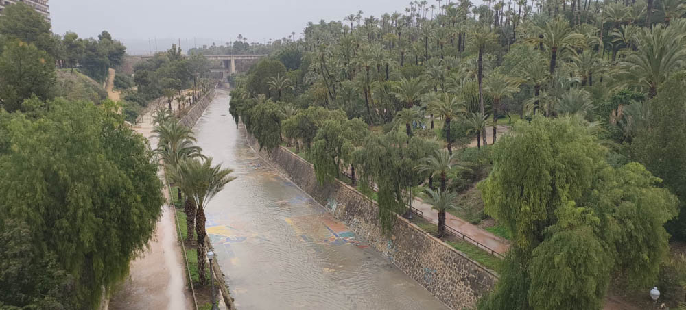 Y la lluvia que ha caído en otras poblaciones está provocando que el río Vinalopó a su paso por Elche lleve más agua de la habitual.
