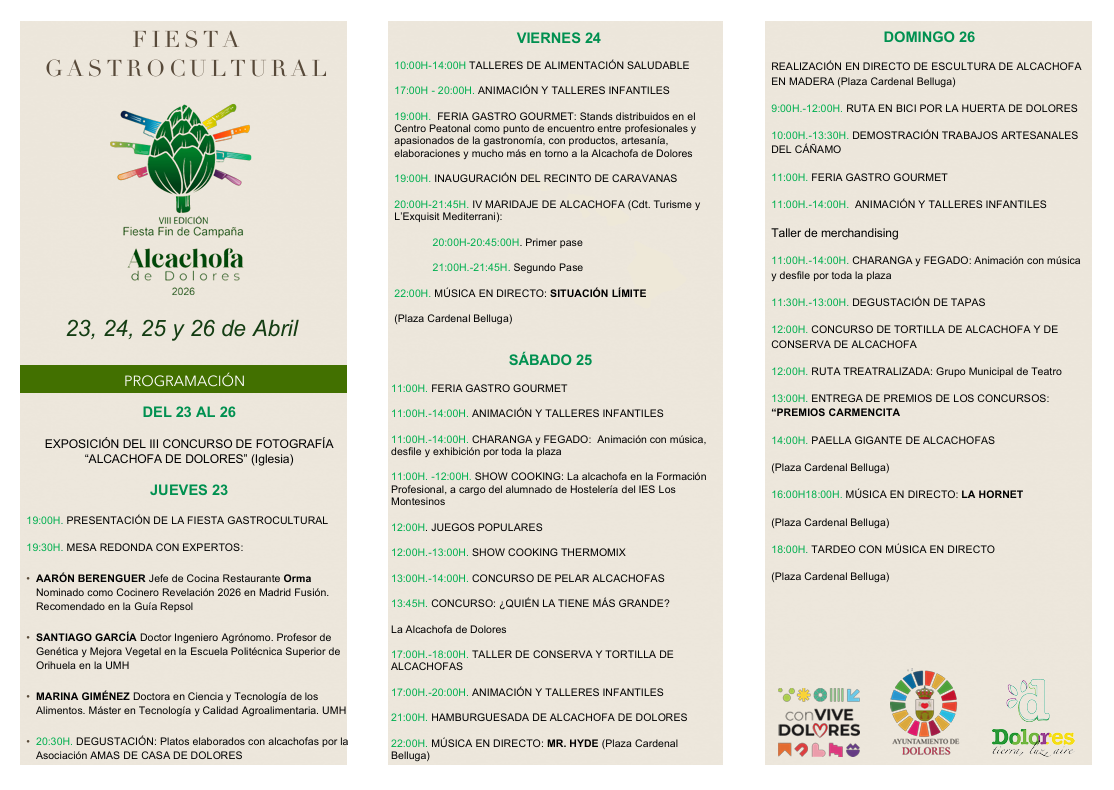 El domingo se hará una ruta en bici por la huerta de Dolores, habrá demostración de trabajos artesanales de cáñamo, se hará una escultura de alcachofa en madera, seguirá la Feria Gastro Gourmet, se harán los concursos de tortilla de alcachofa y de conserva de alcachofa, además de una paella gigante de alcachofas.