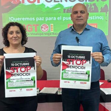 A.S./J.M. Los sindicatos UGT y CCOO han convocado una jornada "de lucha y paro laboral" para este miércoles, 15 de octubre, en todos los "centros de trabajo privados y públicos del territorio, con acciones que den visibilidad a nuestra solidaridad con Palestina en las empresas durante las dos horas centrales de cada turno de trabajo, con la cobertura legal necesaria". Señalan que el "Estado de Palestina y especialmente la población […]