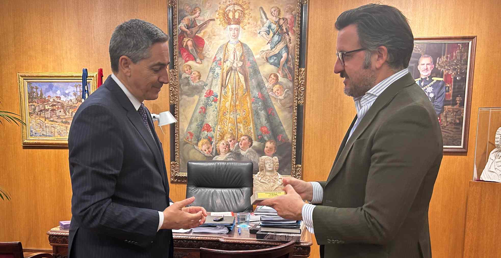 El director ejecutivo de la EUIPO ha visitado el Ayuntamiento de Elche, donde ha firmado en el libro de honor, y ha recibido una reproducción del busto de la Dama de Elche de manos del alcalde.