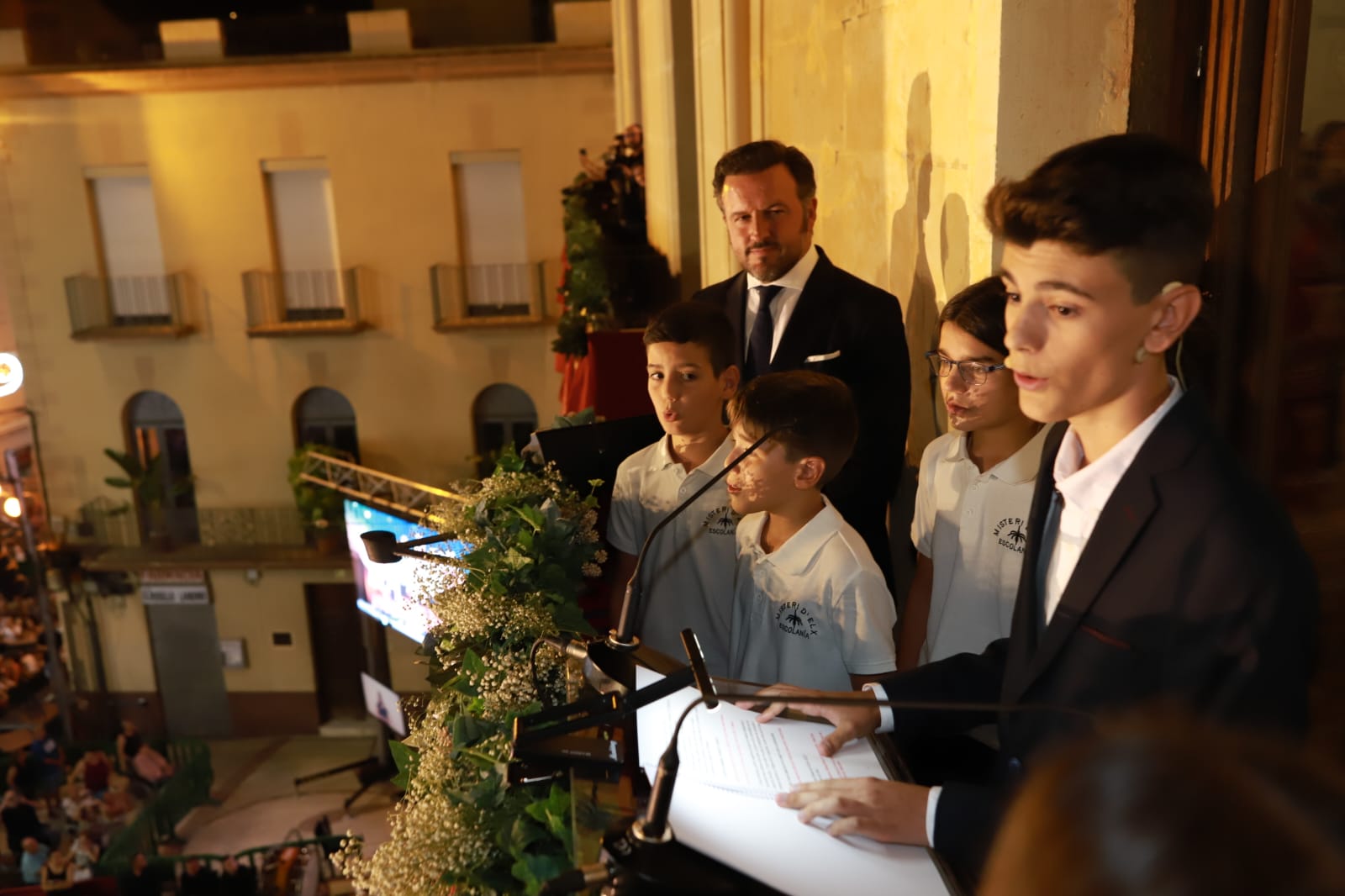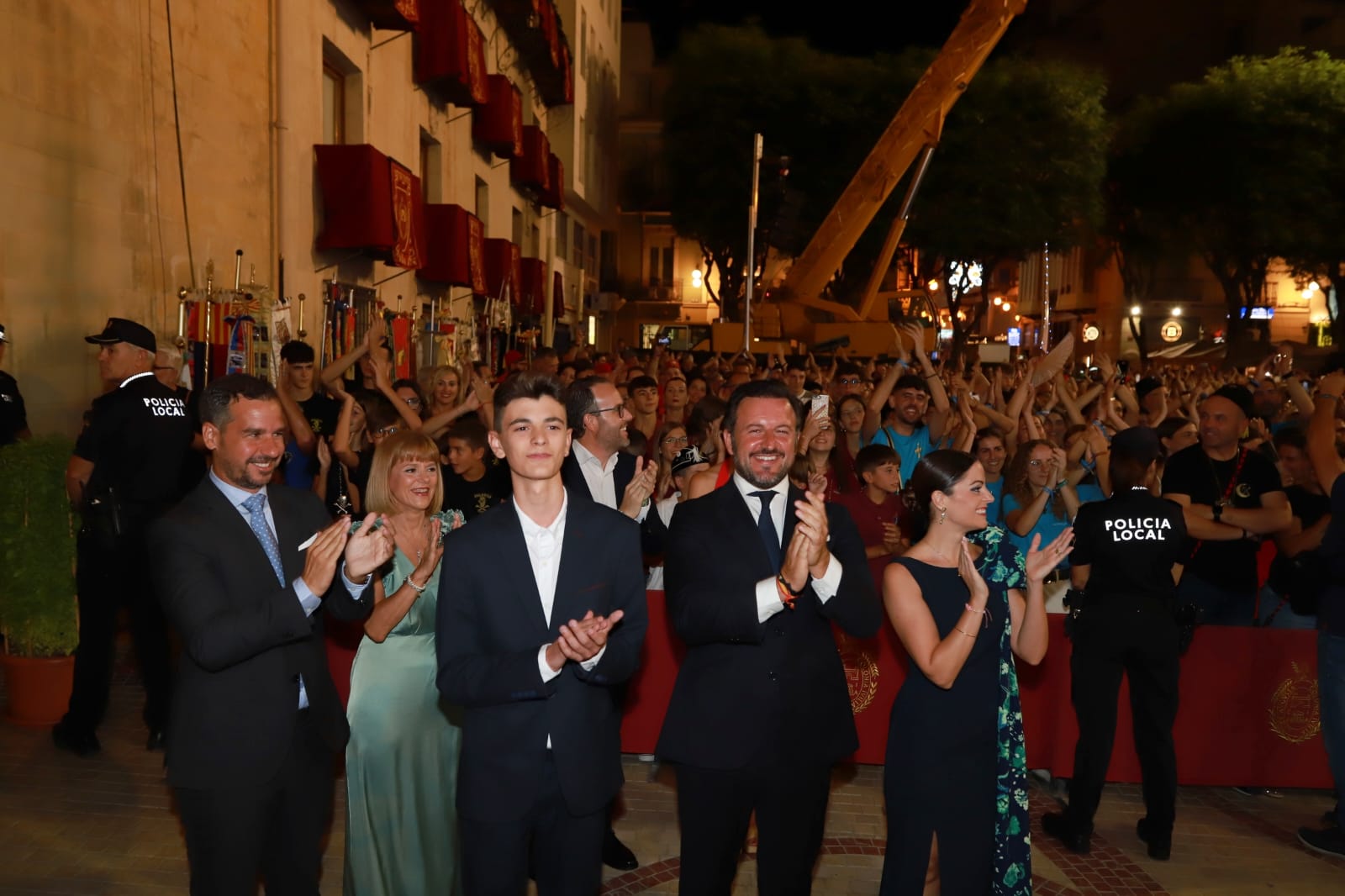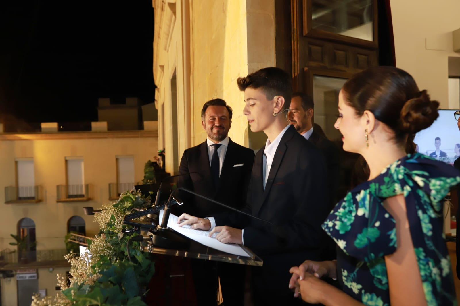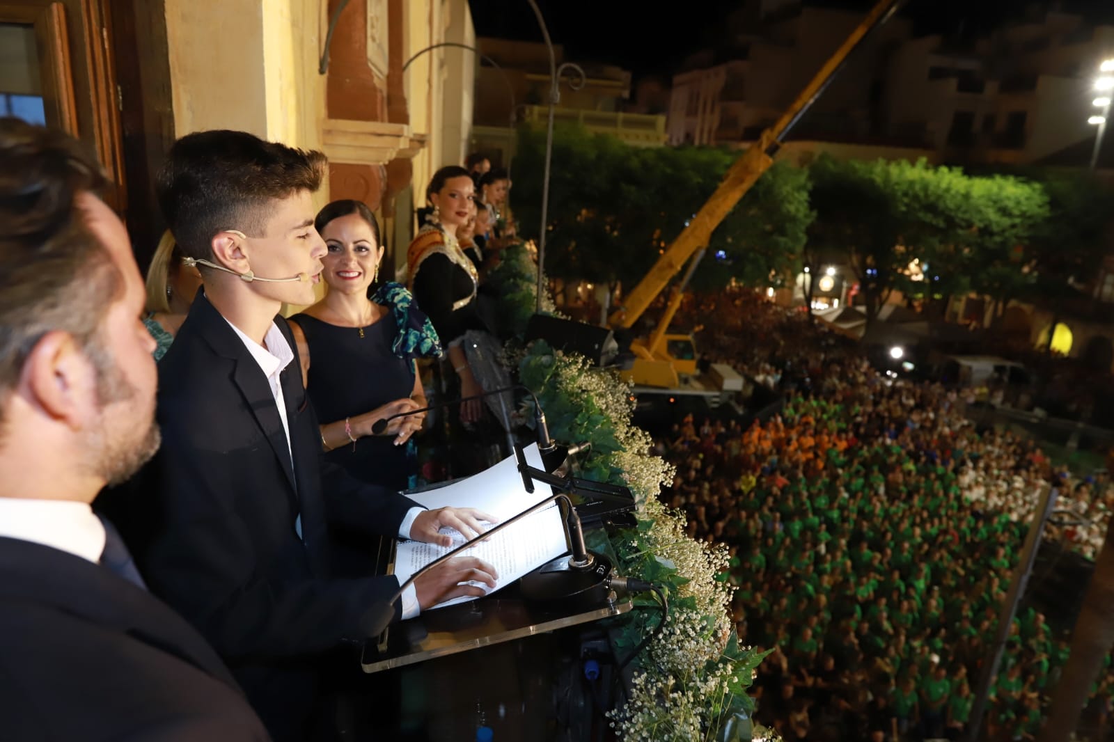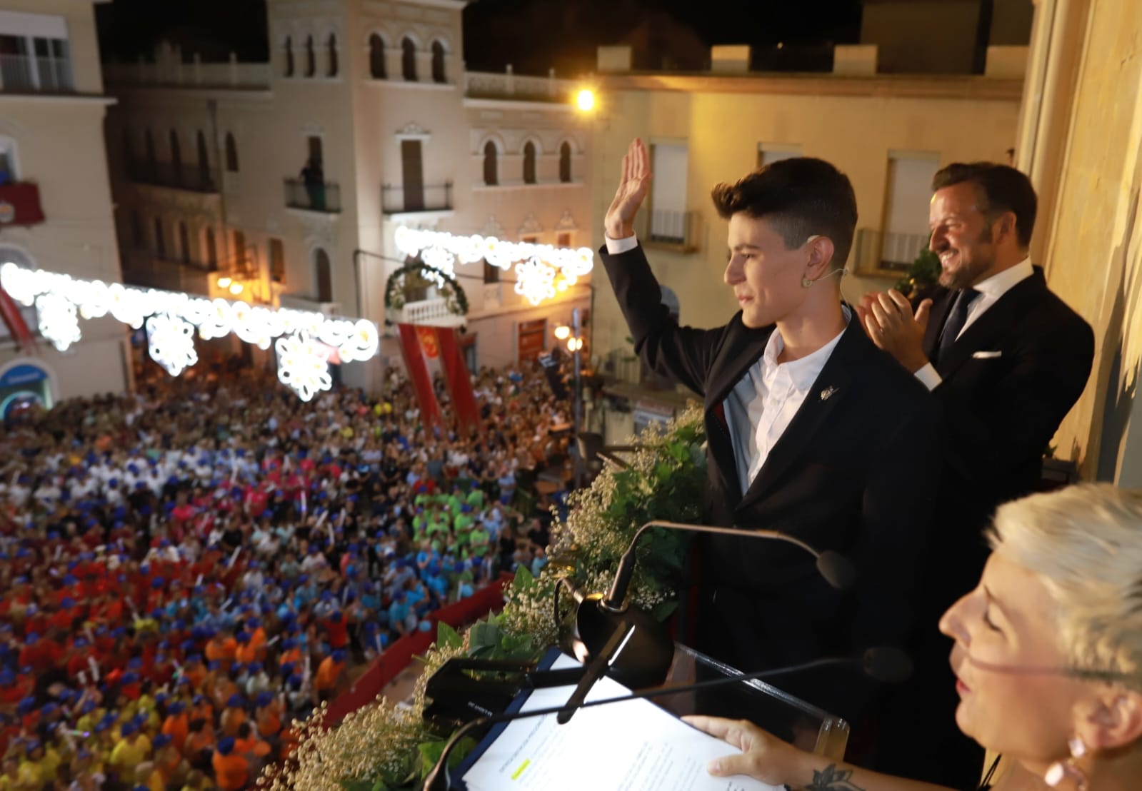 En el balcón, junto al pregonero, al alcalde, a la concejala de Festejos y a los portavoces municipales estaban también las Reinas y Damas de las Fiestas de Elche, el Capitán Moro, el Capitán Cristiano, el Abanderado y la Dama de Heliké.