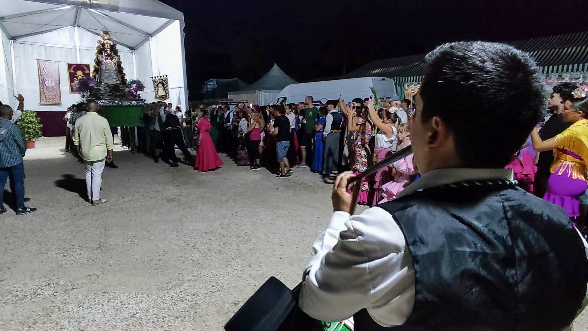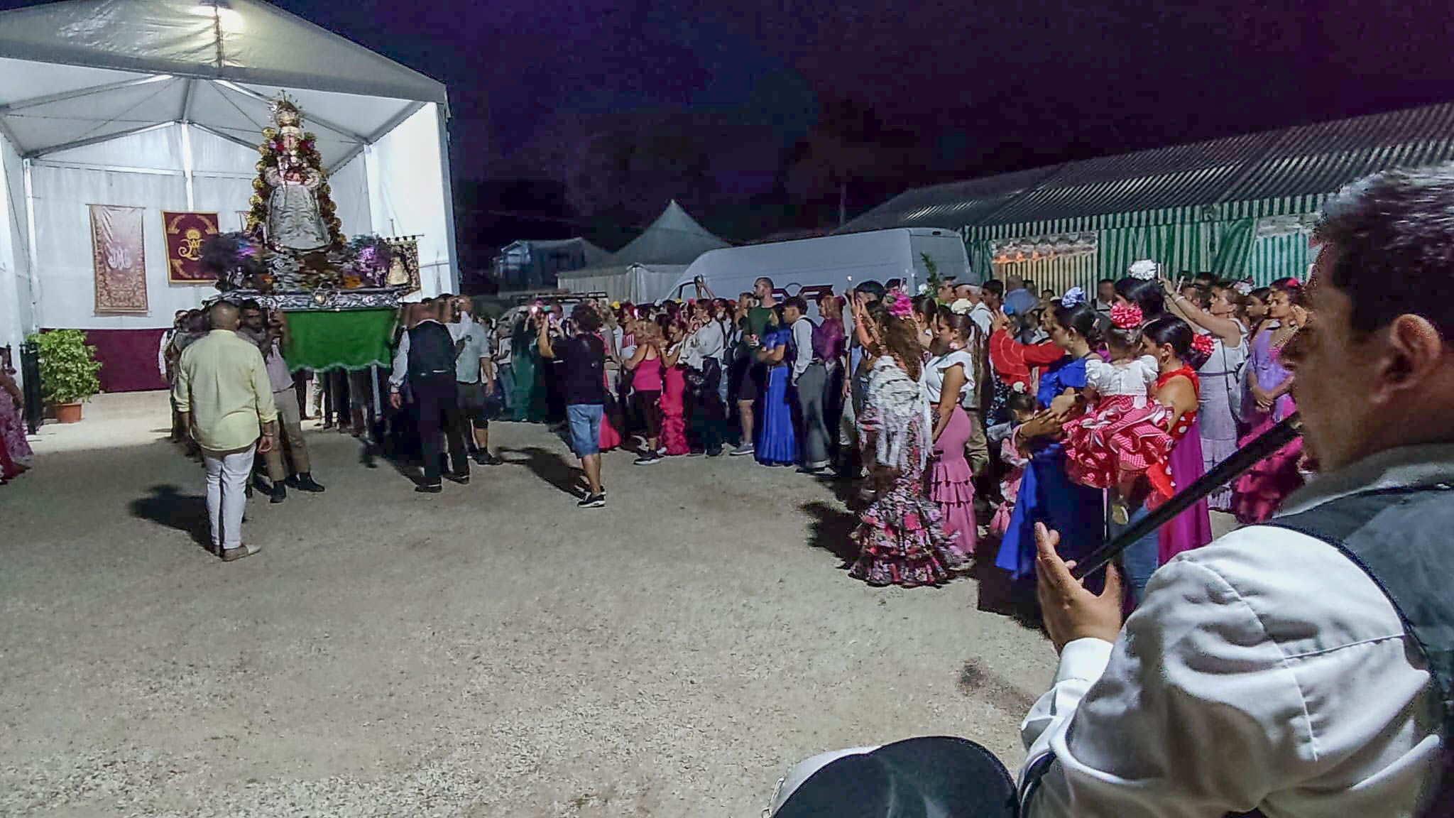 Durante toda la noche ha habido muy buen ambiente en las casetas haciendo frecuentes visitas a la carpa donde se encuentra la Virgen del Rocío. No faltó la comida, el caldo con hierbabuena y el rebujito.