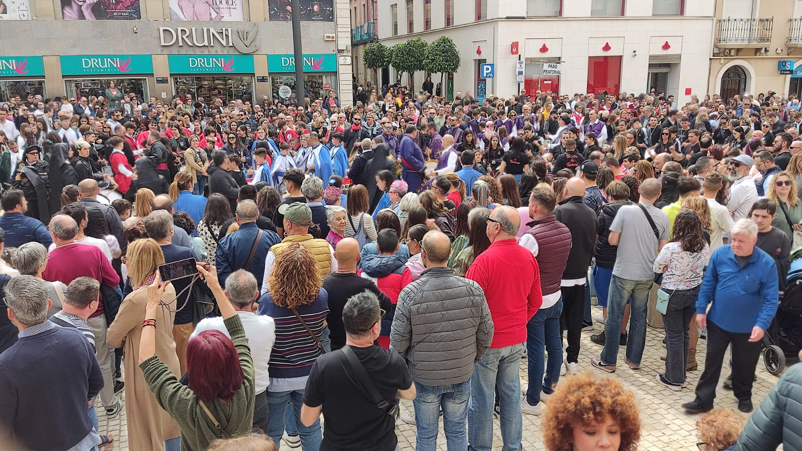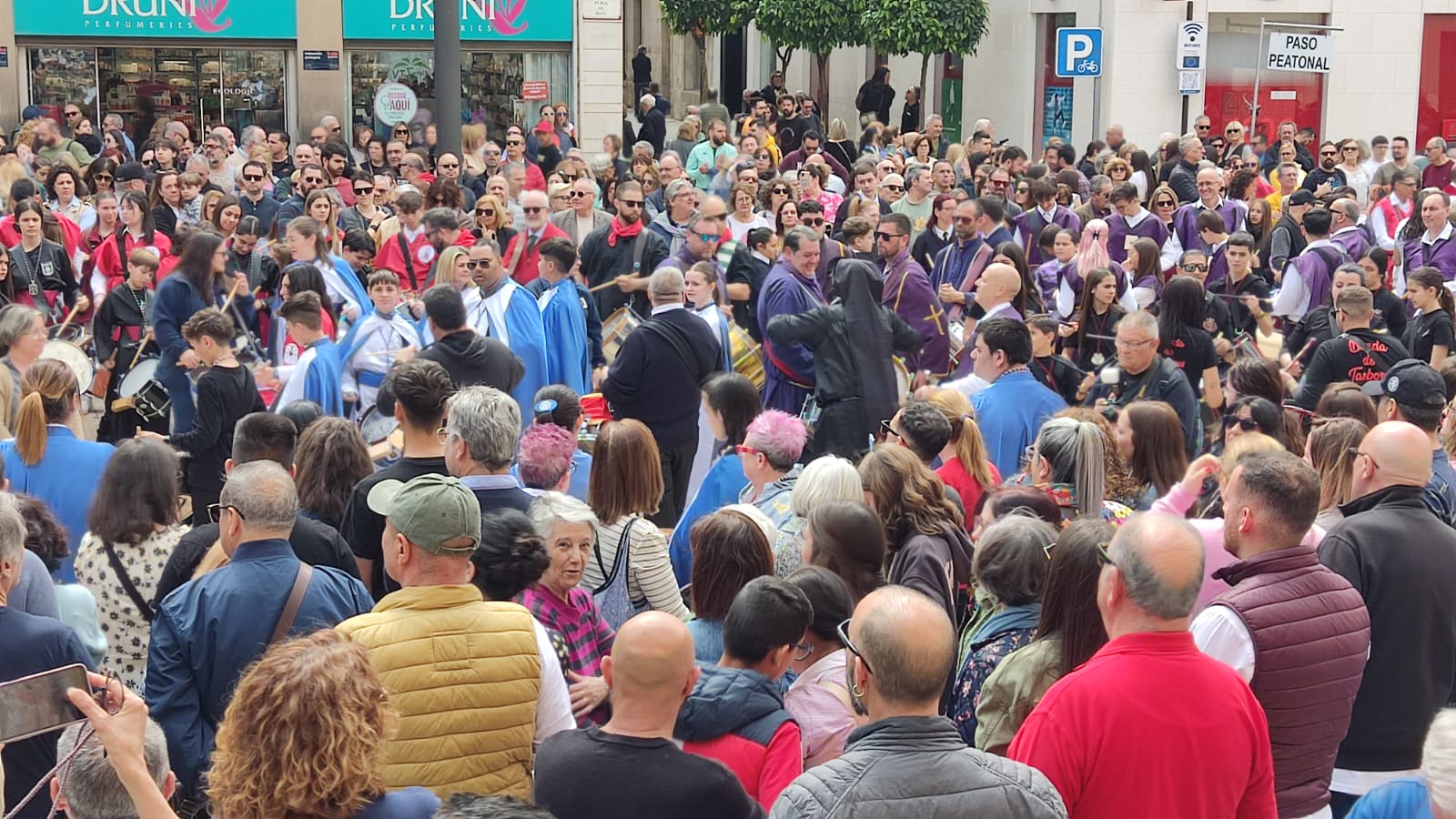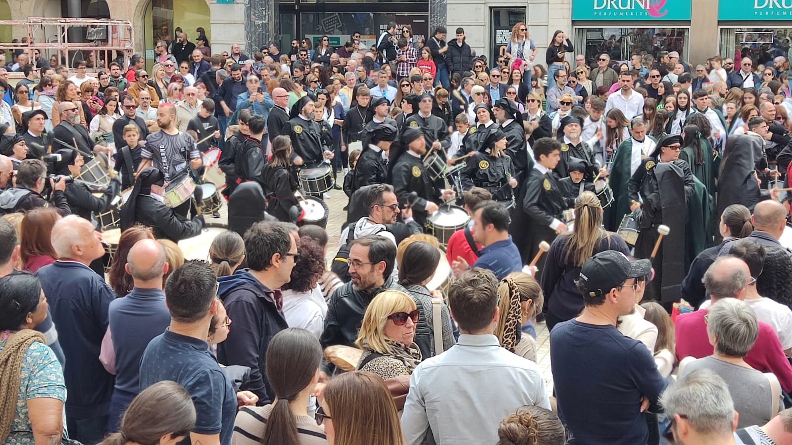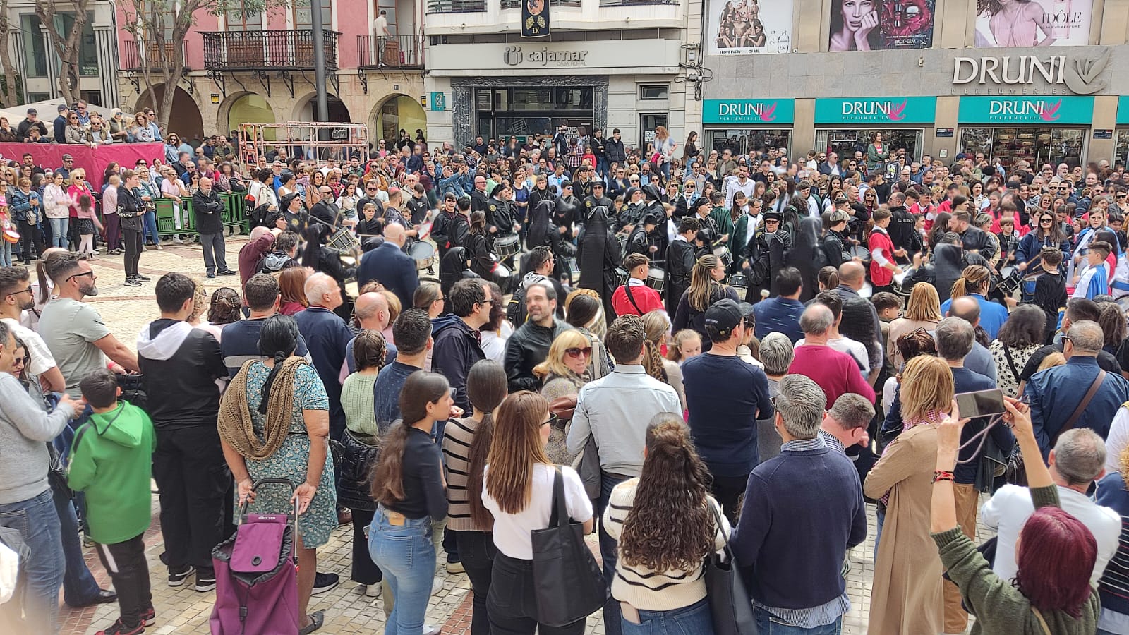 Poco antes de las doce han ido llegando a la Plaça de Baix los grupos de tambores y al mediodía ha comenzado a sonar el estruendo que han hecho las personas que forman parte de las bandas de las cofradías y las hermandades de la Semana Santa de Elche y también del Centro Aragonés de Elche.