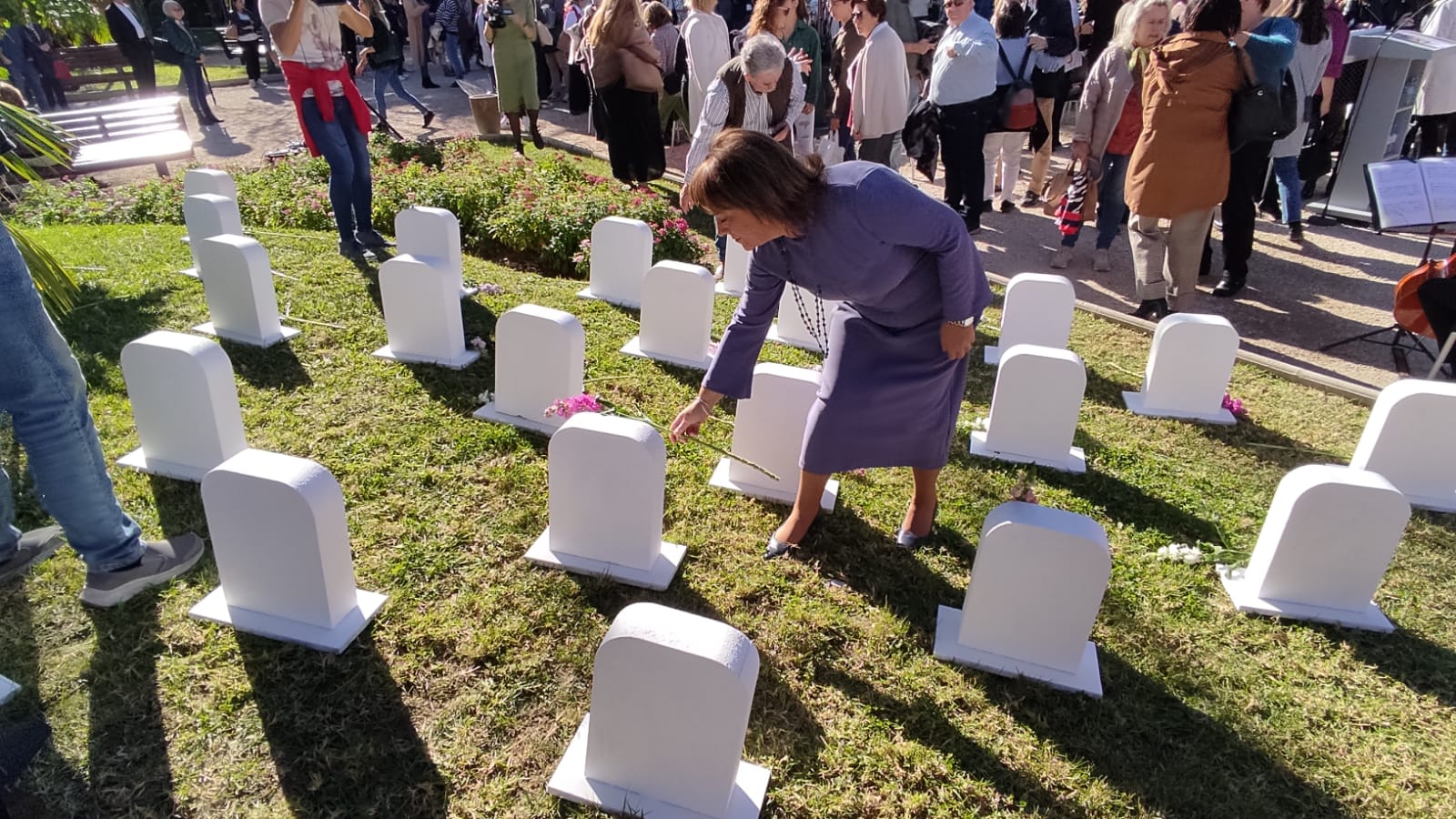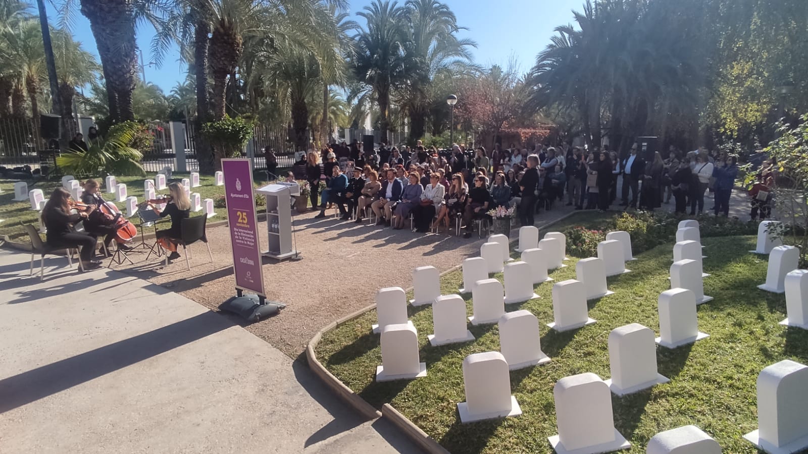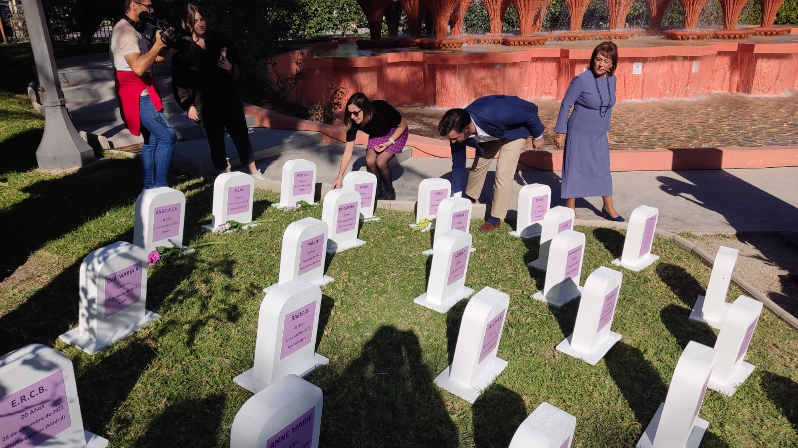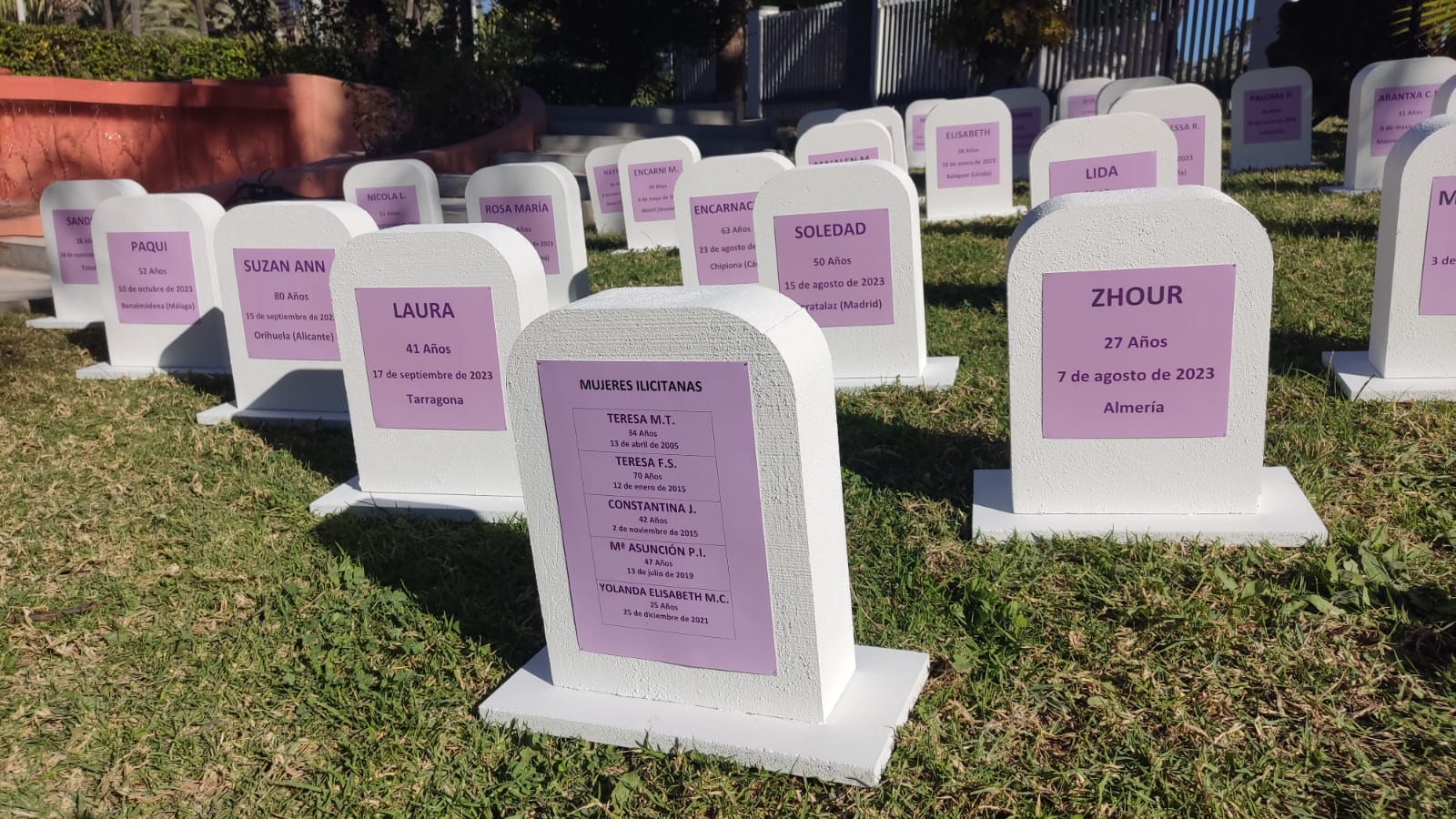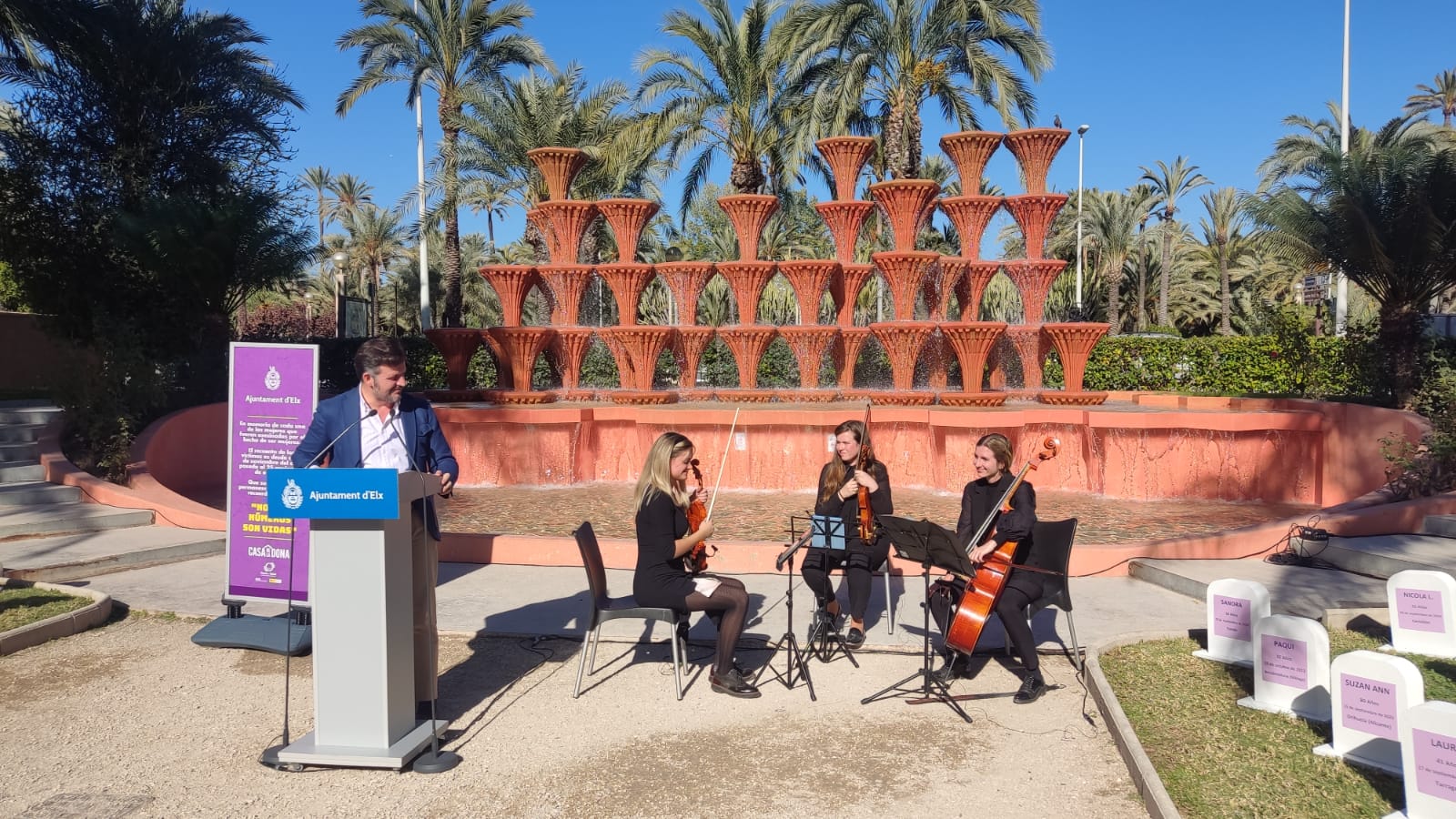 Este mediodía se ha hecho un acto en el Parque Municipal, junto a la fuente. A ambos lados se han dispuesto lápidas con los nombres de las 52 mujeres que han sido asesinadas este año 2023 y las 11 que fueron asesinadas en el último mes de 2022. También había una lápida con los nombres de las cinco mujeres que han sido asesinadas en Elche en los últimos años. Las lápidas se mantendrán hasta el lunes para que durante este fin de semana las puedan ver las personas que paseen por el parque.