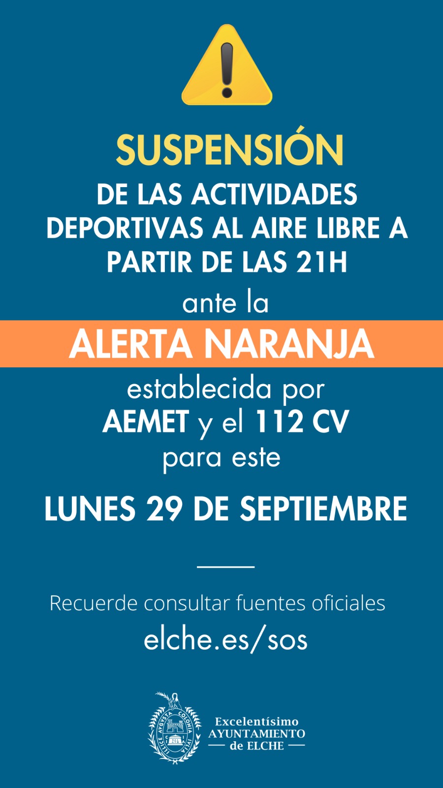 A.S./J.M. El Ayuntamiento de Elche comunicaba esta tarde que se suspendían las actividades deportivas al aire libre a partir de las 21:00 horas por la alerta naranja establecida por la AEMET.