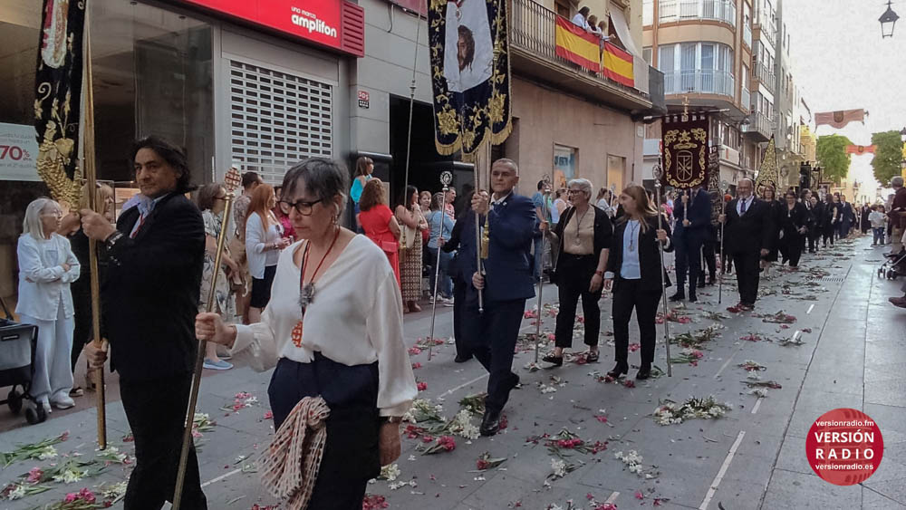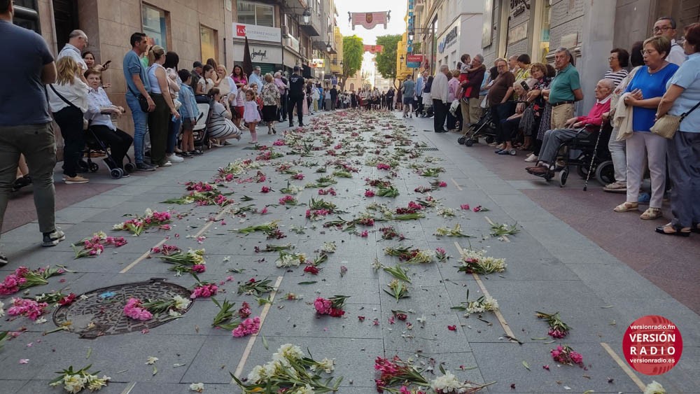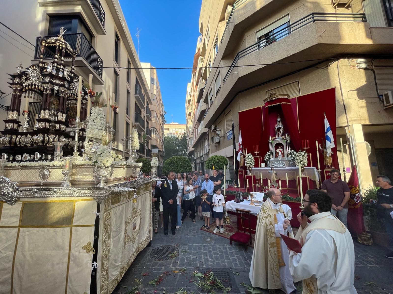 Empleados municipales abrían la procesión creando una alfombra de baladre y trencaolla. Cuando ha terminado la procesión, en este caso, operarios del servicio de limpieza de UTE Elche han dejado limpio todo el recorrido.