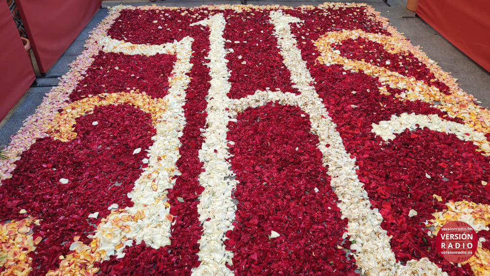 A las puertas de la Basílica de Santa María se ha elaborado un alfombra de flores, que ha llamado la atención a todas las personas que se han acercado hasta el lugar.