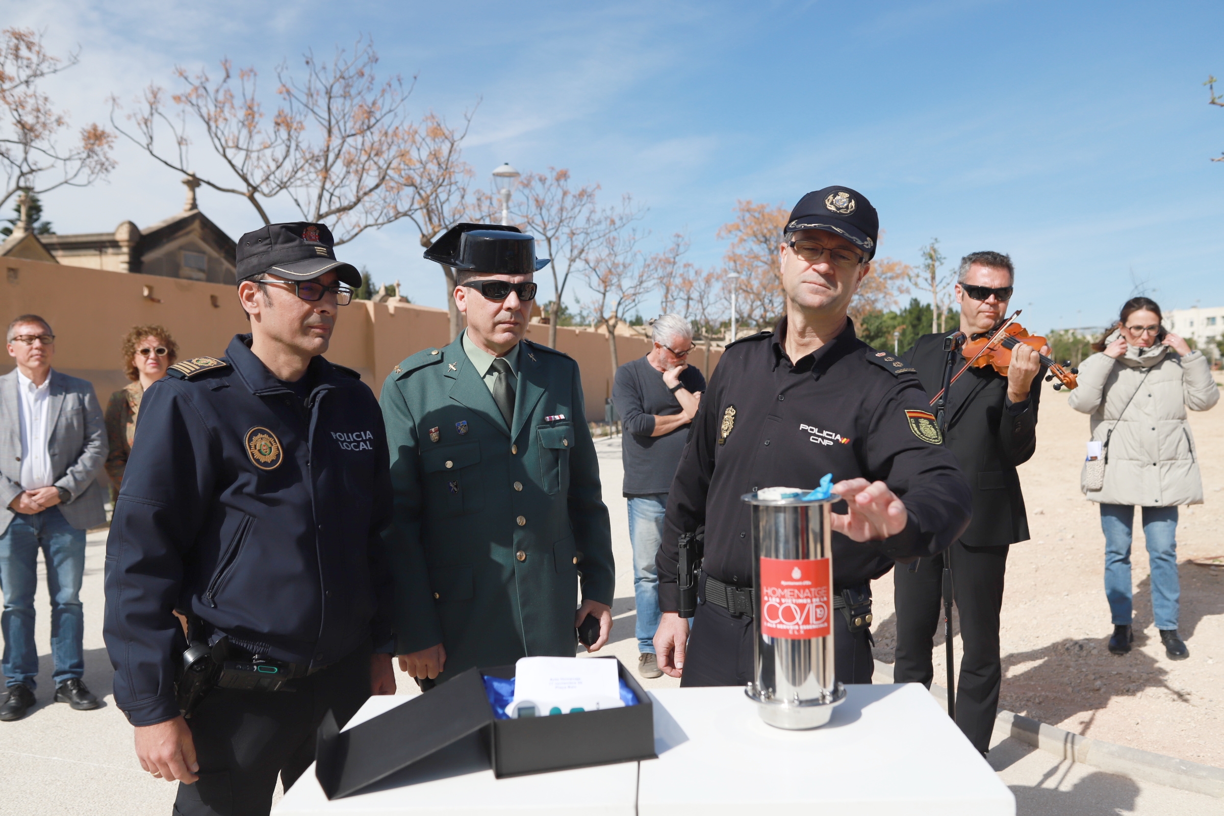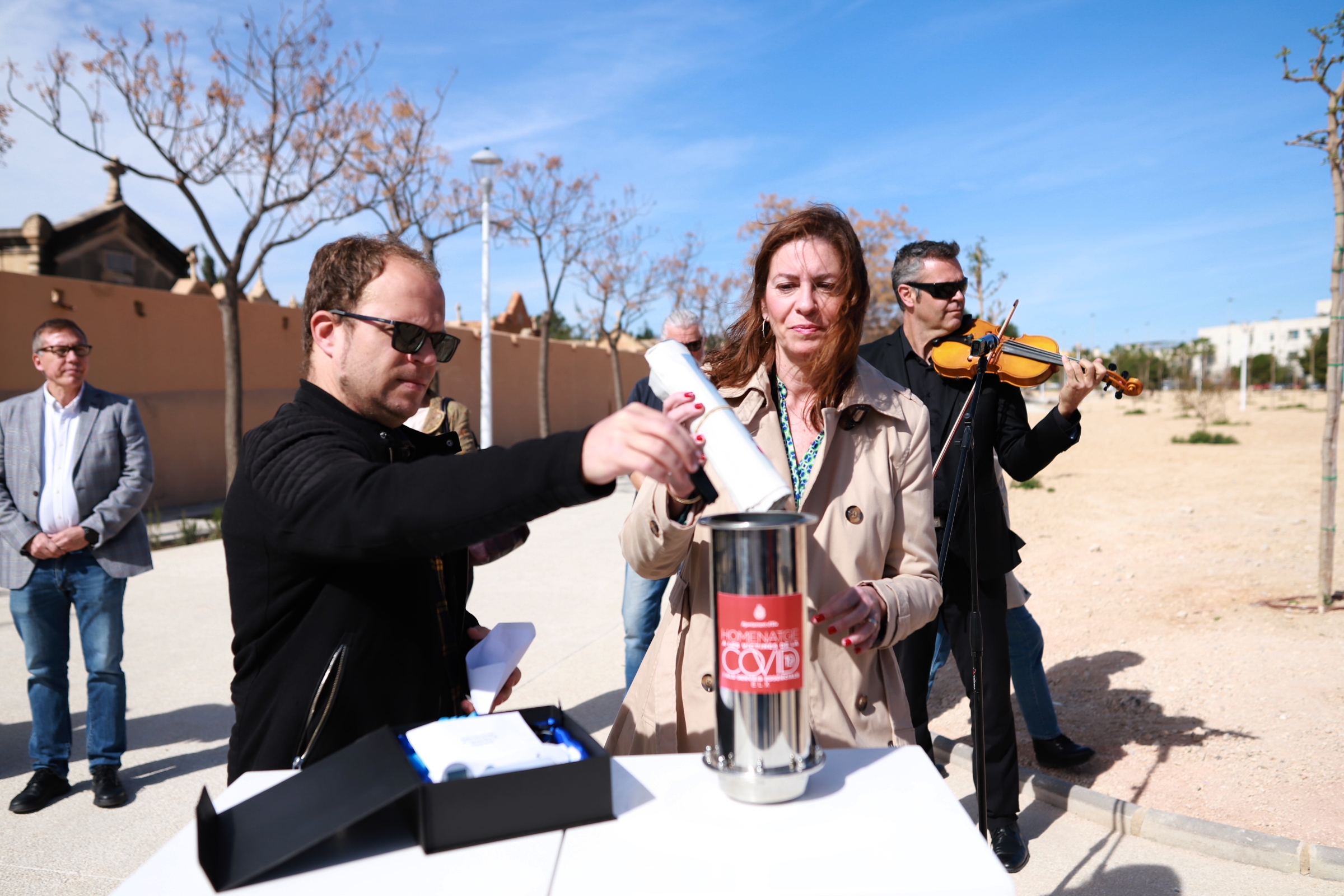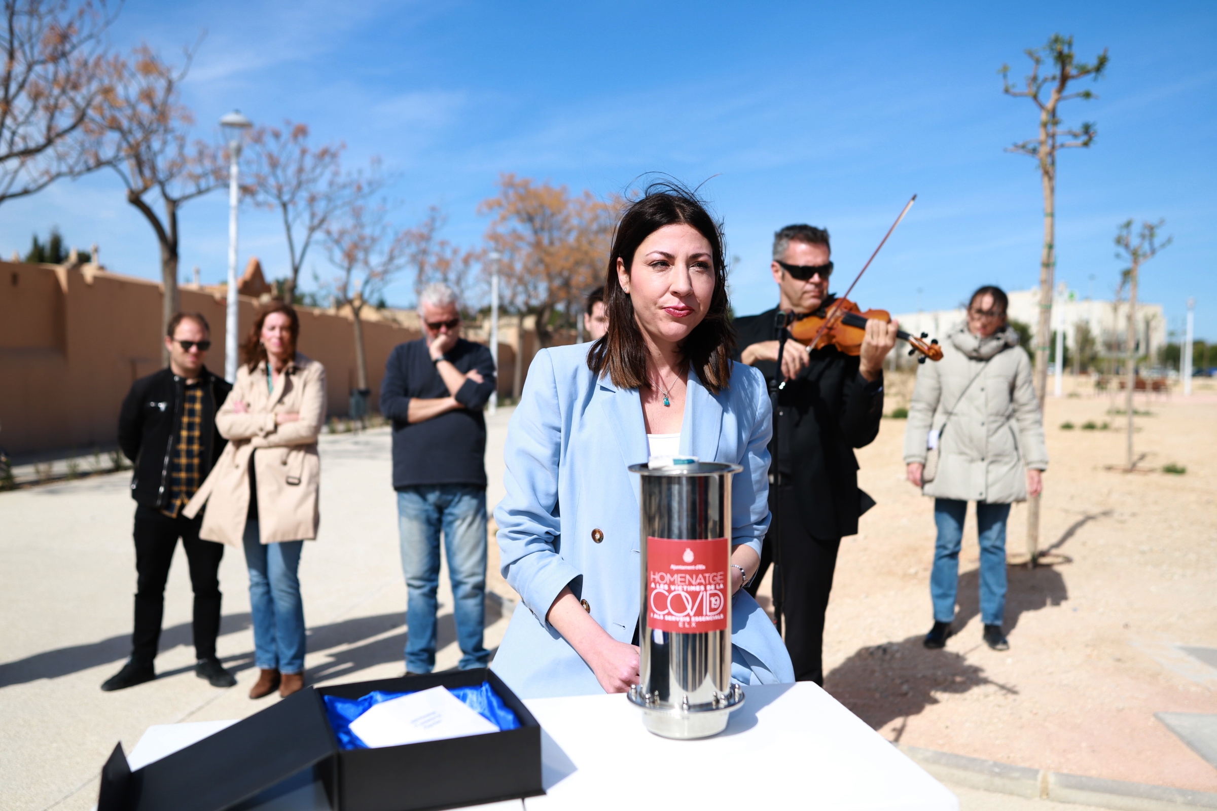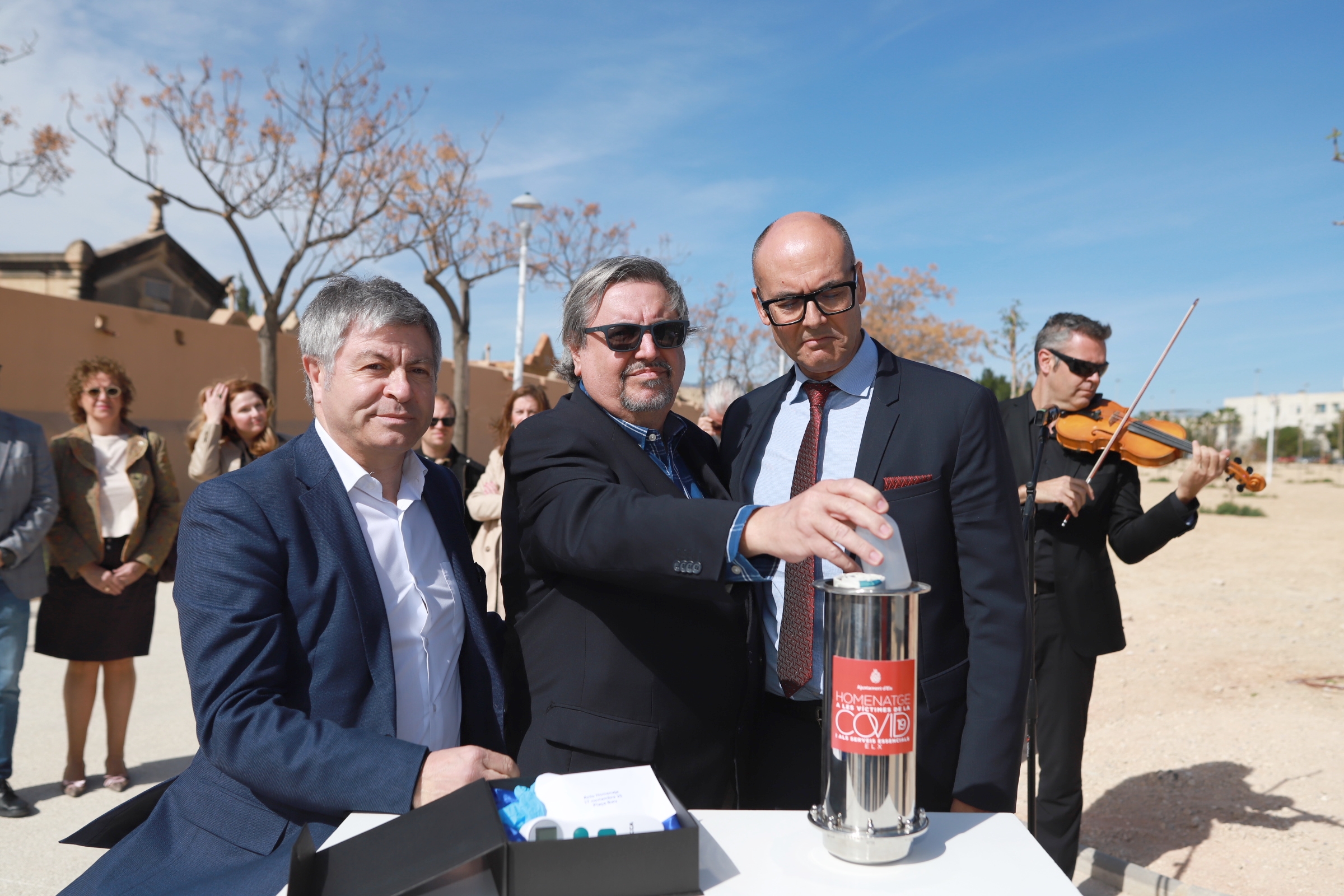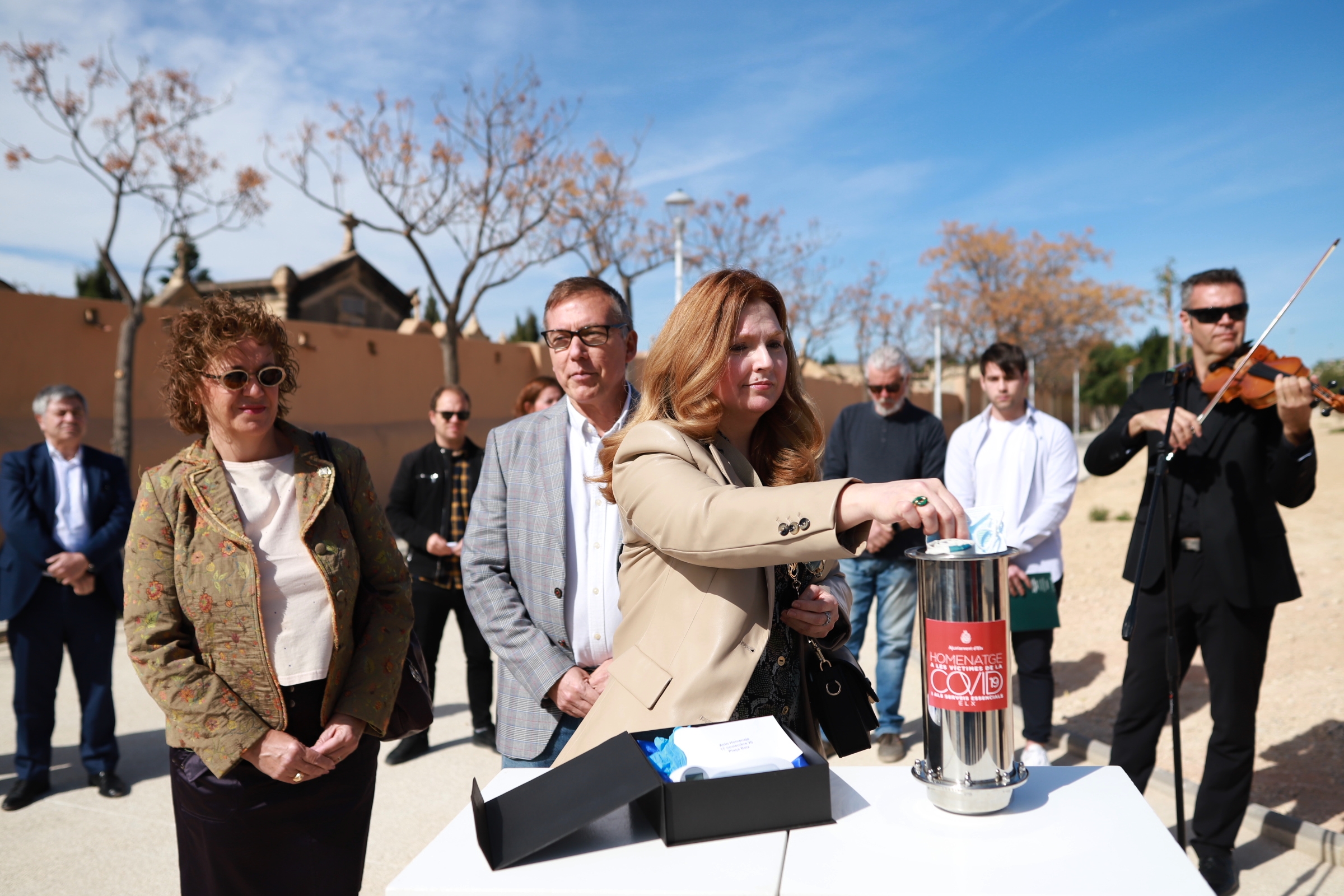 En el acto, presentado por Javier Muñoz, se ha descubierto un monolito en el que se puede leer: «Elx, en record a les víctimes i afectats per la pandemia de la COVID-19 i en agraïment a les persones que han oferit el seu treball i la seua solidaritat en benefici de tots els il·licitans i il·licitanes».