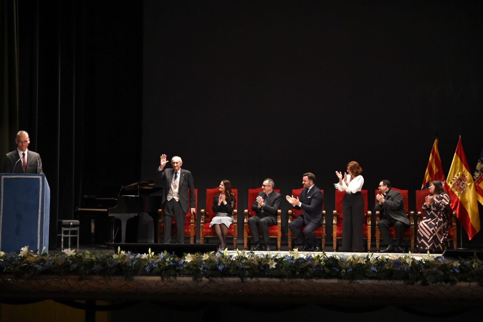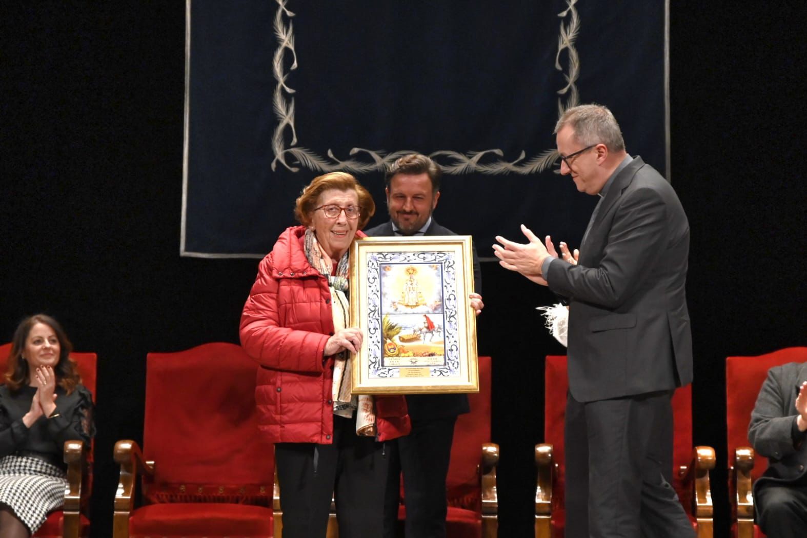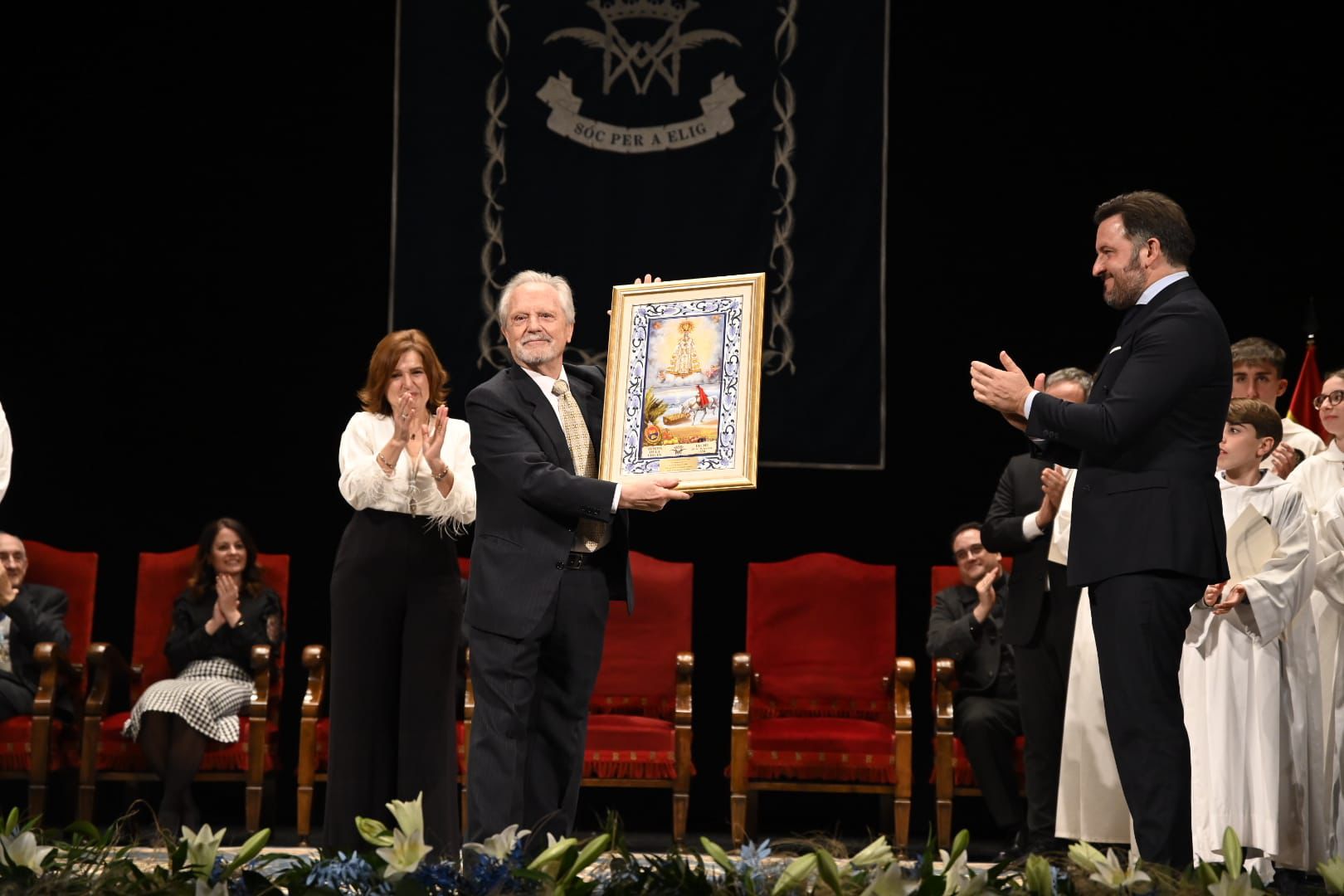 El acto ha comenzado con el Himno de Elche, interpretado por Salvador Cotes. También se ha escuchado la marcha “Sóc per a Elig” y se ha estrenado el “Himno del Ilicitano Ausente”, compuesto por Vicente Sempere Gomis, que ha recibido los aplausos del público y una distinción por parte del alcalde de Elche, Pablo Ruz, y de la presidenta de la Sociedad Venida de la Virgen, Fina Mari Román.