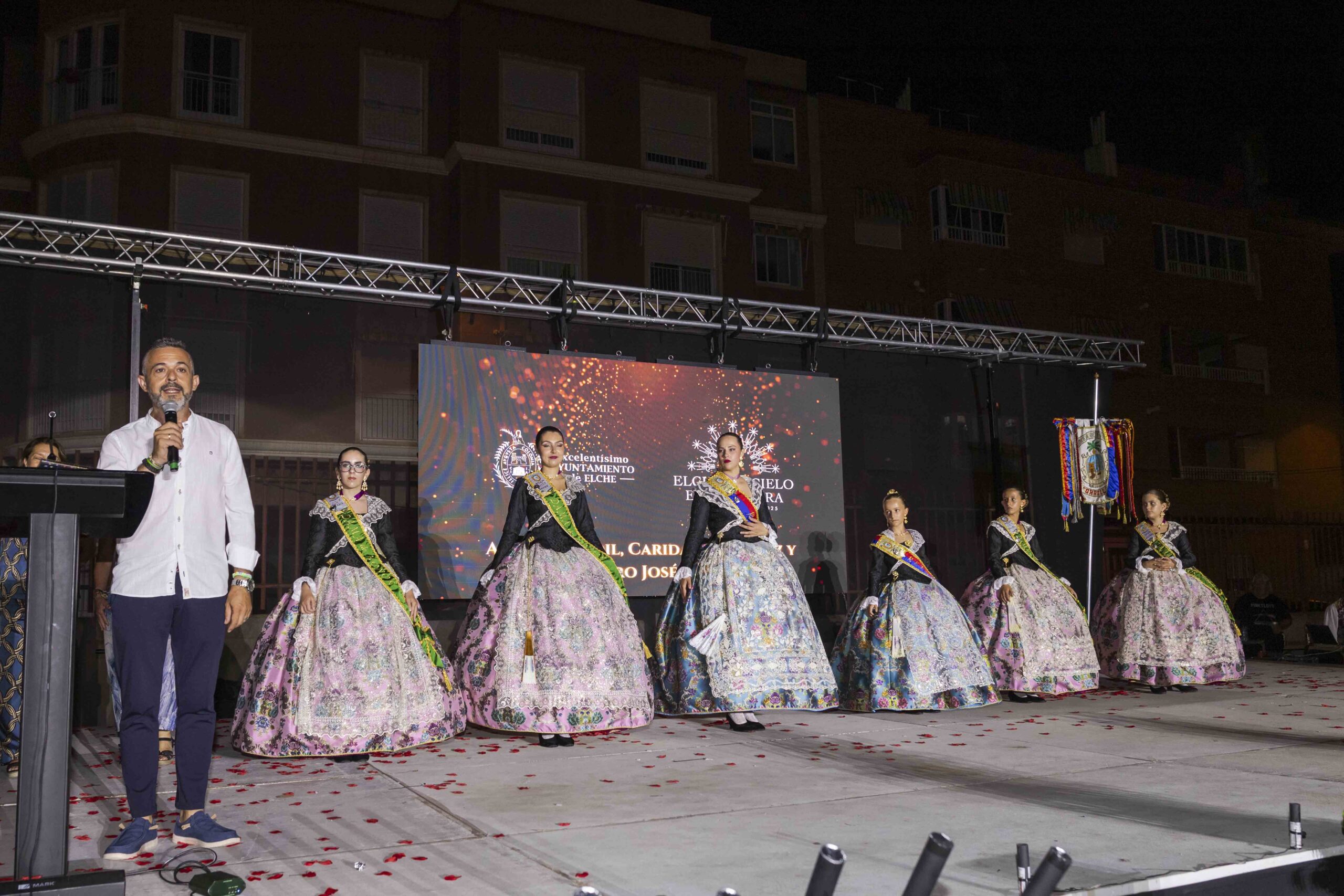 El acto contó con la presencia de la Reina Mayor y las Damas Mayores de Elche, Nuria Tejero, Marta Martínez y Claudia Cámara, acompañadas por miembros de la Federación Gestora de Festejos Populares; representantes de la Unió de Festers del Camp d’Elx (UFECE) con su presidente, Andrés Coves, al frente; la concejala de Infancia, Familia y Mayores, Aurora Rodil; el concejal de Pedanías, Pedro José Sáez; la concejala de Mujer, Comercio y Hostelería, Caridad Martínez; miembros de la corporación municipal; y el pedáneo, Toni Esclapez, entre otras autoridades y representantes de distintas entidades sociales y culturales.