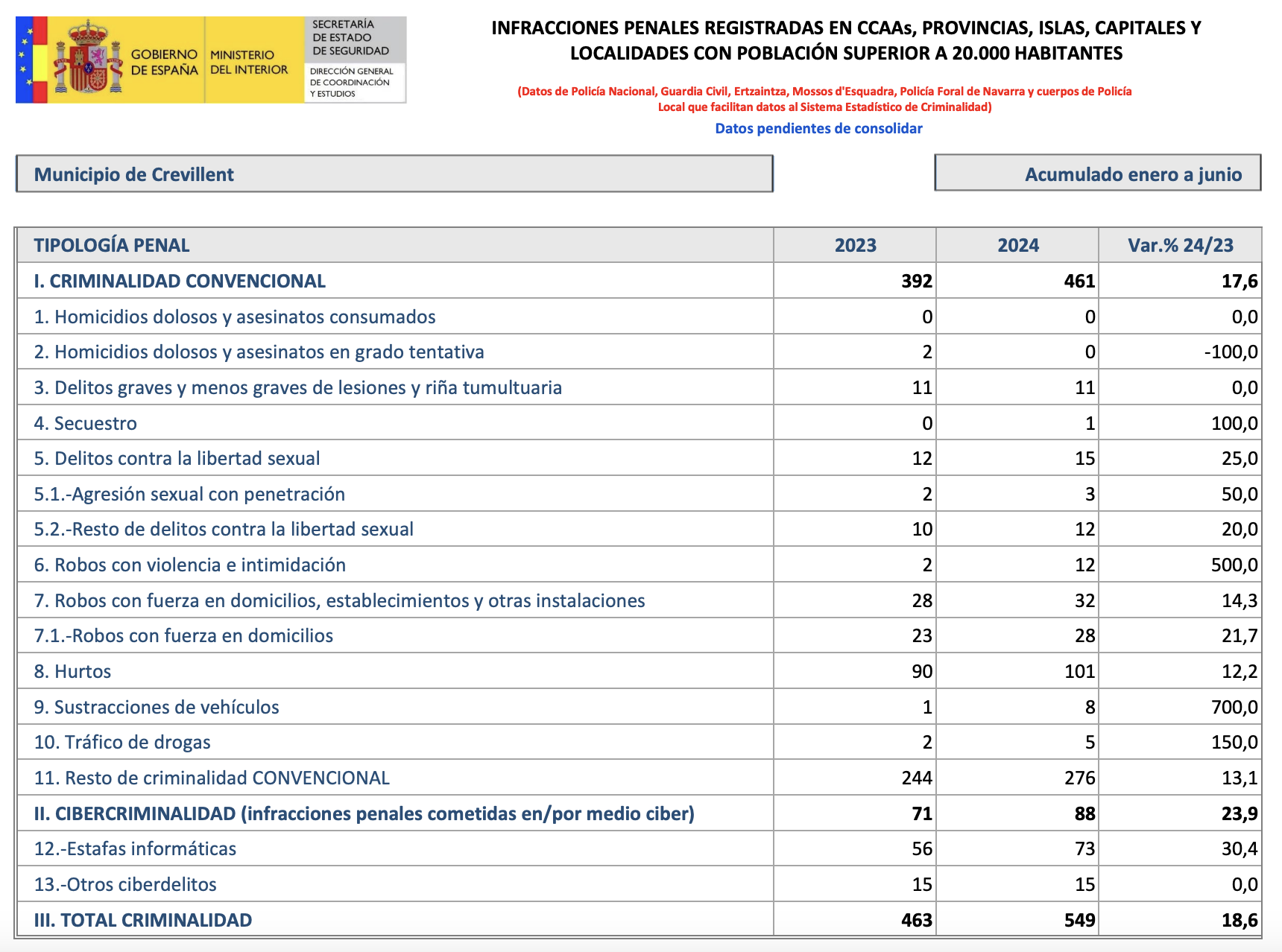 En Crevillent, el total de delitos ha pasado de 463 a 549, una subida del 18,6%.