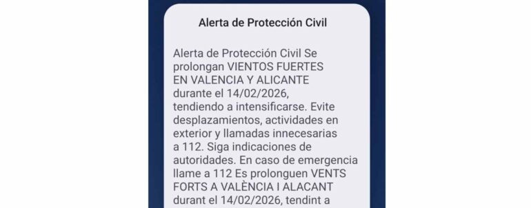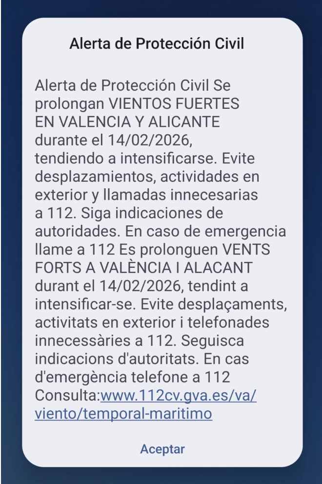 A.S./J.M. A las 18:08 horas se ha recibido en los teléfonos móviles de Alicante y Valencia una alerta de Protección Civil con este mensaje: “Alerta de Protección Civil. Se prolongan VIENTOS FUERTES EN VALENCIA Y ALICANTE durante el 14/02/2026, tendiendo a intensificarse. Evite desplazamientos, actividades en exterior y llamadas innecesarias a 112. Siga indicaciones de autoridades. En caso de emergencia llamea 112. Es prolonguen VENTS FORTS A VALÈNCIA I ALACANT durant el 14/02/2026, tendint a intensificar-se. Evite desplaçaments, activitats en exterior i telefonades innecessàries a 112. Seguisca indicacions d’autoritats. En cas d’emergència telefone a 112. Consulta. www.112cv.gva.es/va/viento/temporal-maritimo”.