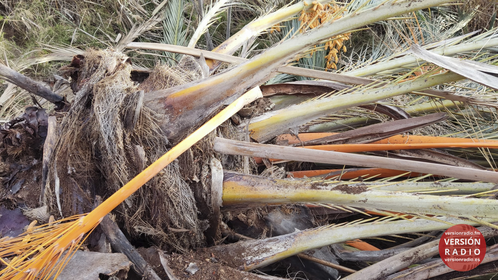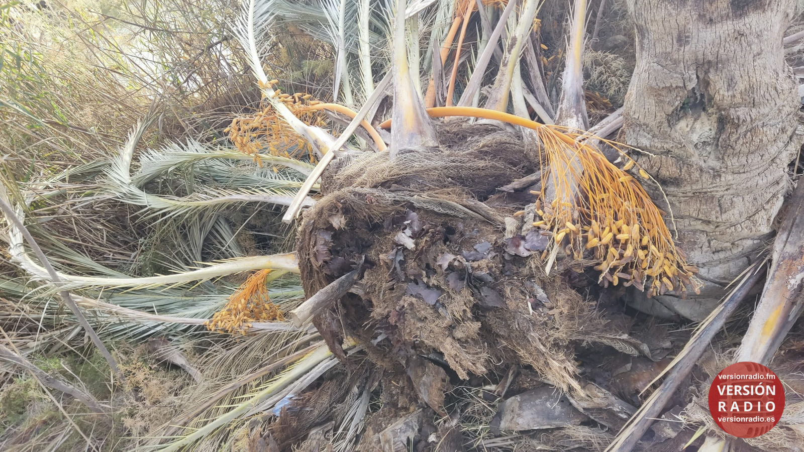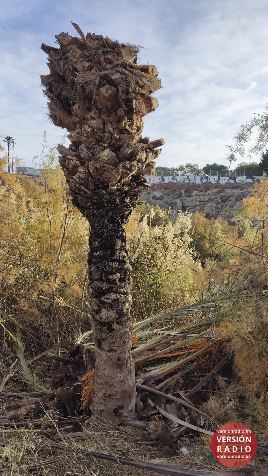 En el cauce del río Vinalopó a su paso por Elche, en la margen derecha, hay personas que han advertido estos días una palmera cuya parte superior estaba caída, incluso con ramas de dátiles.