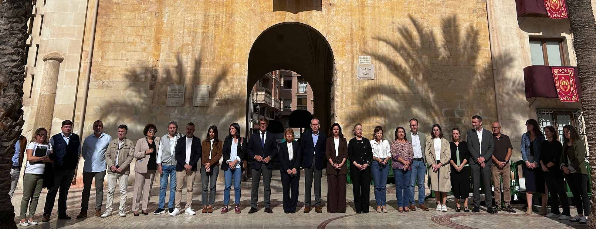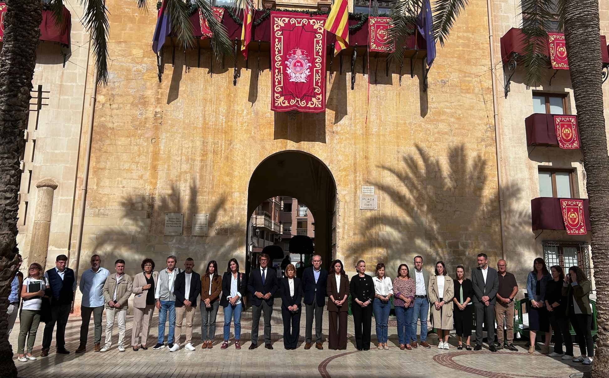 En Crevillent, la primera teniente de alcalde, Gema Escolano, junto con miembros de la corporación municipal, han guardado un minuto de silencio a las puertas del Ayuntamiento con motivo del primer aniversario de la DANA del 29 de octubre de 2024, en recuerdo de todas las víctimas y personas afectadas por aquella riada.