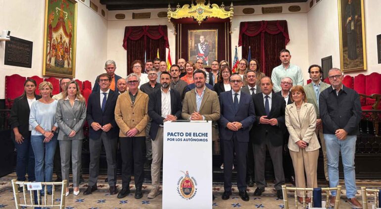 A.S./J.M. El salón de plenos ha acogido este jueves el acto de firma del Pacto de Elche por los Autónomos, que han suscrito una treintena de entidades de la ciudad además de los portavoces del PP, Juan de Dios Navarro; y de Vox, Aurora Rodil; además del concejal Promoción Económica, Samuel Ruiz; y el alcalde, Pablo Ruz.